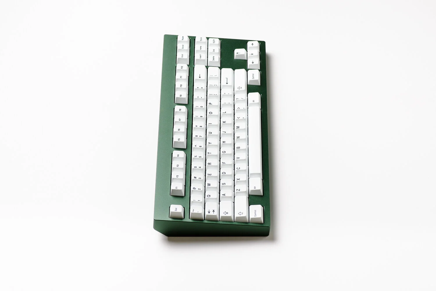 The Viridian colorway is more of an emerald green than viridian as the name suggests (viridian tends to be more of a blue hue). I absolutely love the green anodization, and think it pairs particularly well with keycap sets that utilize white, black, or any sort of earthy tones. Under light, the anodized green surface transitions between darker and lighter shades. The bottom of the keyboard and the default aluminum plate are also a dark grey that looks much more sophisticated than plain black.